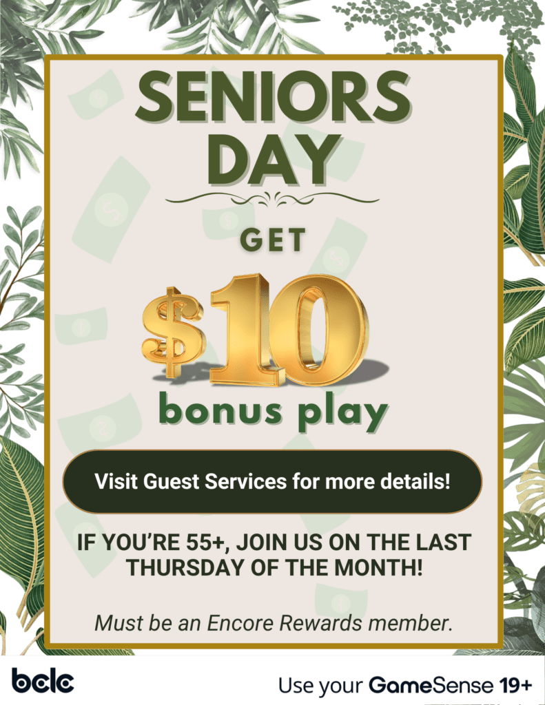 For 55+, come and visit us with your Encore Rewards card on the last Thursday of every month to receive a $10 bonus play.