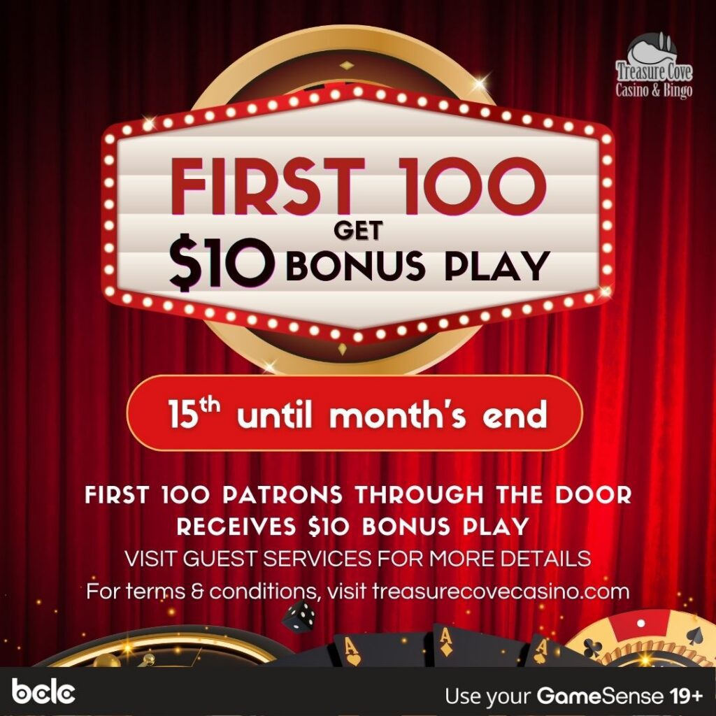 Be one of the first 100 patrons in the casino and get $10 in bonus play!
